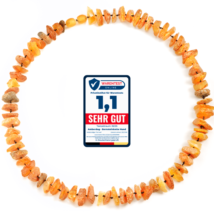 Diese Bernsteinkette ist ein hochwertiges Naturprodukt und kein Arzneimittel. Aussagen zur Wirkung beruhen auf Erfahrungswerten von Tierhaltern, nicht auf wissenschaftlichen Studien. Sie ersetzt keine tierärztliche Beratung.