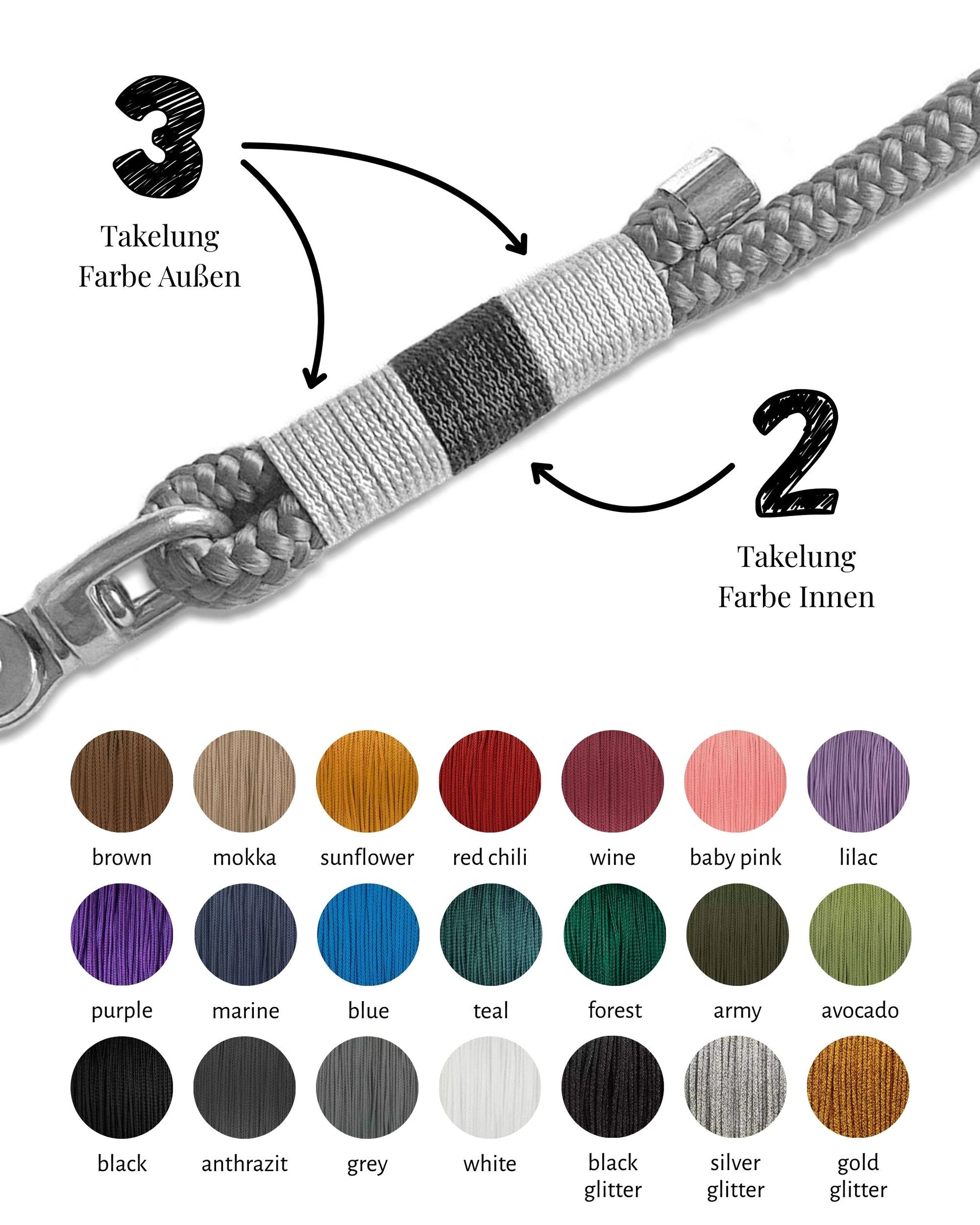 Takelung: Unsere Leinen sind dreifach gesichert; sie werden von Hand geklebt, genäht und getakelt um für einen sicheren Verschluss zu sorgen. Bei dem Garn und der Takelung handelt es sich um Nylon-Microcord, welches widerstandsfähig, UV-, verrottungs- und schimmelbeständig ist. Somit ist es stark und langlebig.