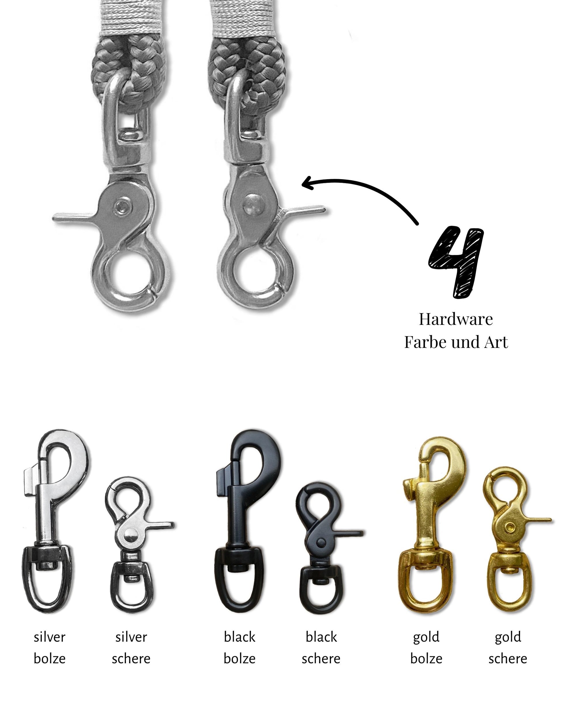 Hardware: Die Leine verfügt über hochwertige 360-Grad-Karabiner für eine einfache und stilvolle Befestigung. Es kommen zudem hochwertige Ringe zum Einsatz, um für eine optimale Sicherheit zu sorgen. Unsere goldene (Messing) Hardware wird mit Schutzlack behandelt, der die natürliche Oxidierung/Verdunkelung entschleunigt.